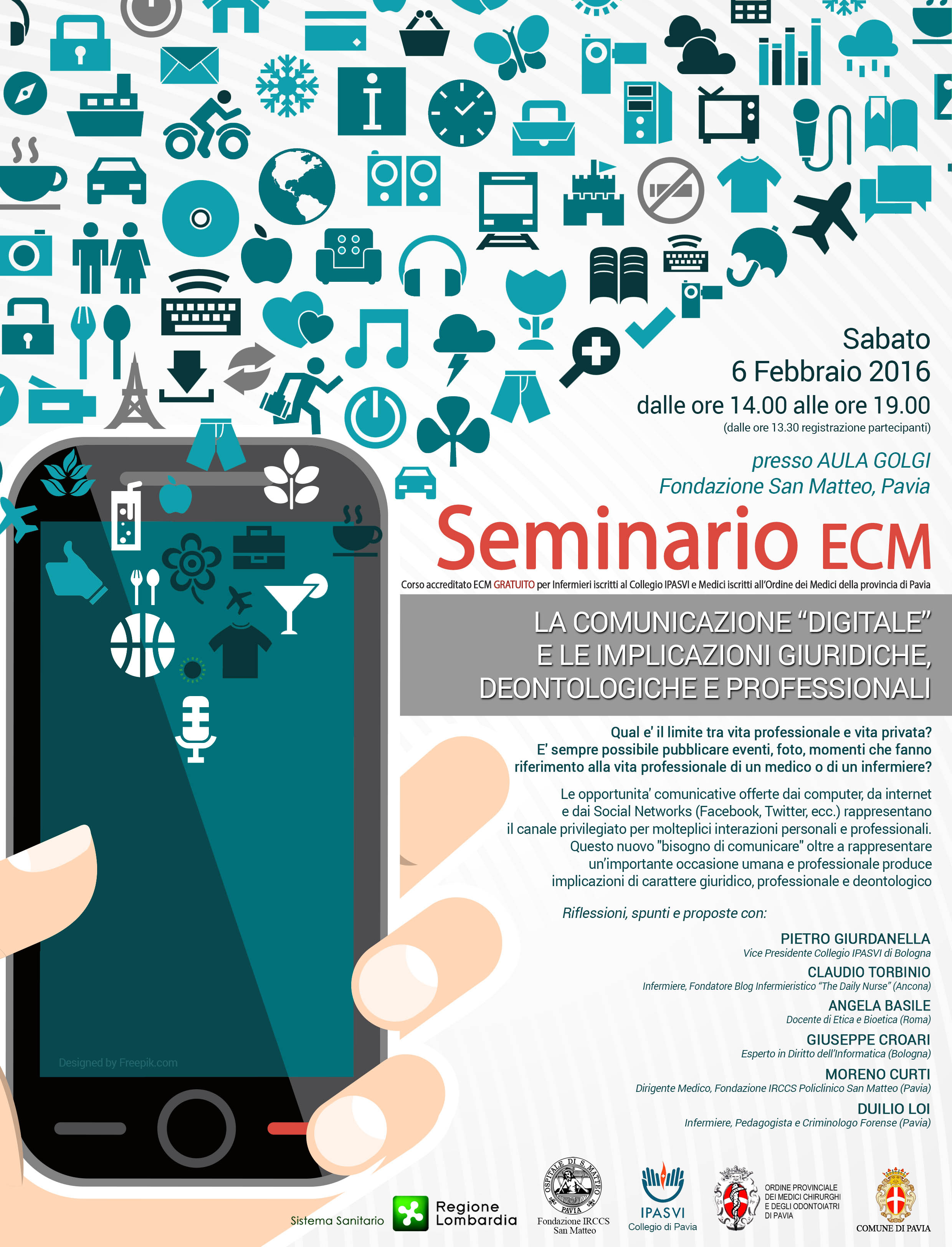 Sabato 6 Febbraio 2016 presso l’Aula Golgi della Fondazione San Matteo di Pavia si è tenuto il terzo seminario sugli aspetti giuridici, professionali e deontologici della comunicazione digitale organizzato dal Collegio IPASVI di Pavia in collaborazione con l’Ordine dei Medici.