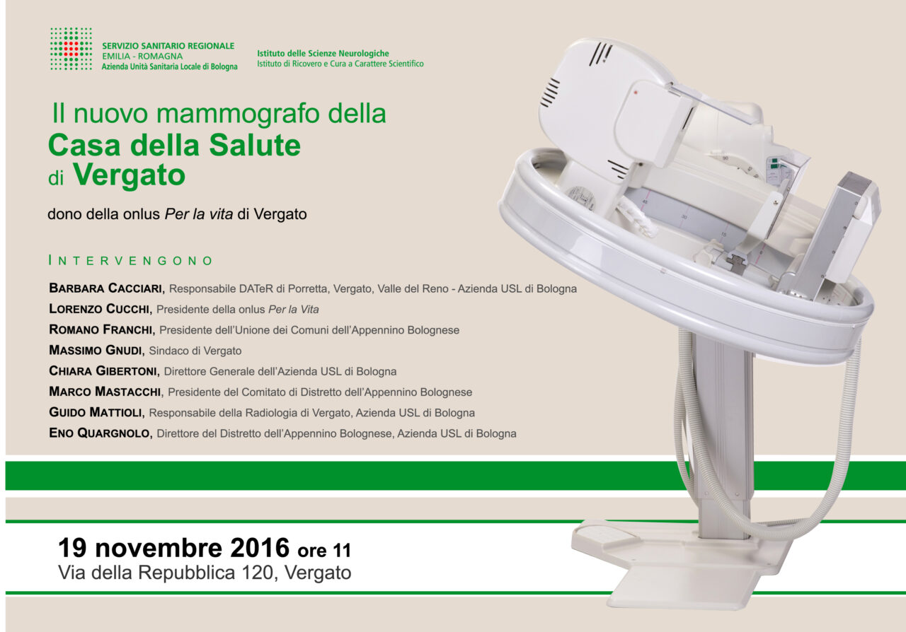 Si arricchisce la dotazione tecnologica della Casa della Salute di Vergato. Sabato 19 novembre, alle 11, si inaugura il nuovo mammografo digitale Giotto Image donato dalla onlus Per la Vita, grazie ad una raccolta fondi che ha coinvolto cittadini e Associazioni del territorio vergatese.