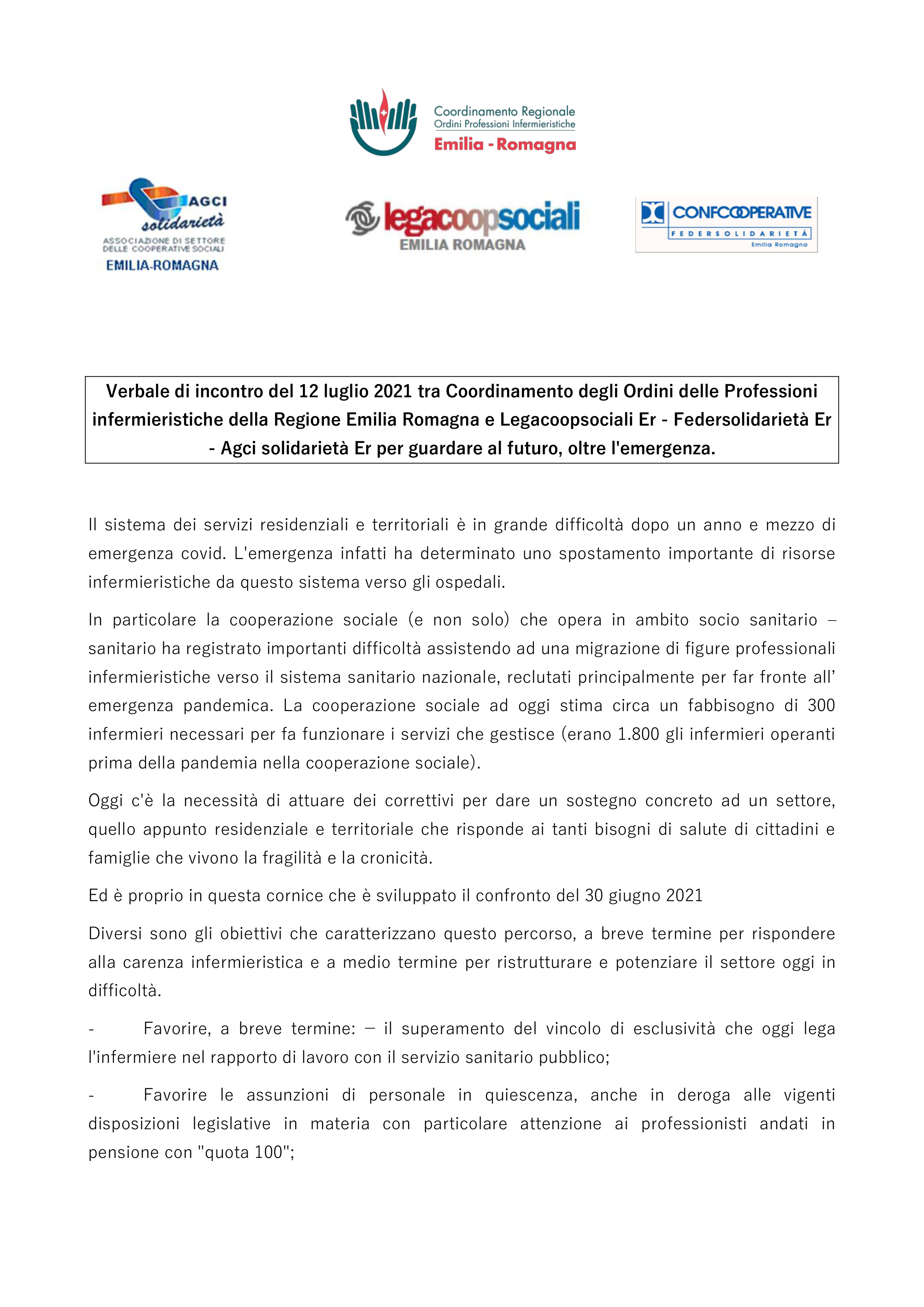 Nei giorni scorsi l’incontro tra il Coordinamento degli Ordini delle Professioni infermieristiche della Regione Emilia Romagna e Legacoopsociali Er – Federsolidariet Er – Agci solidarietà Er per guardare al futuro, oltre l’emergenza.