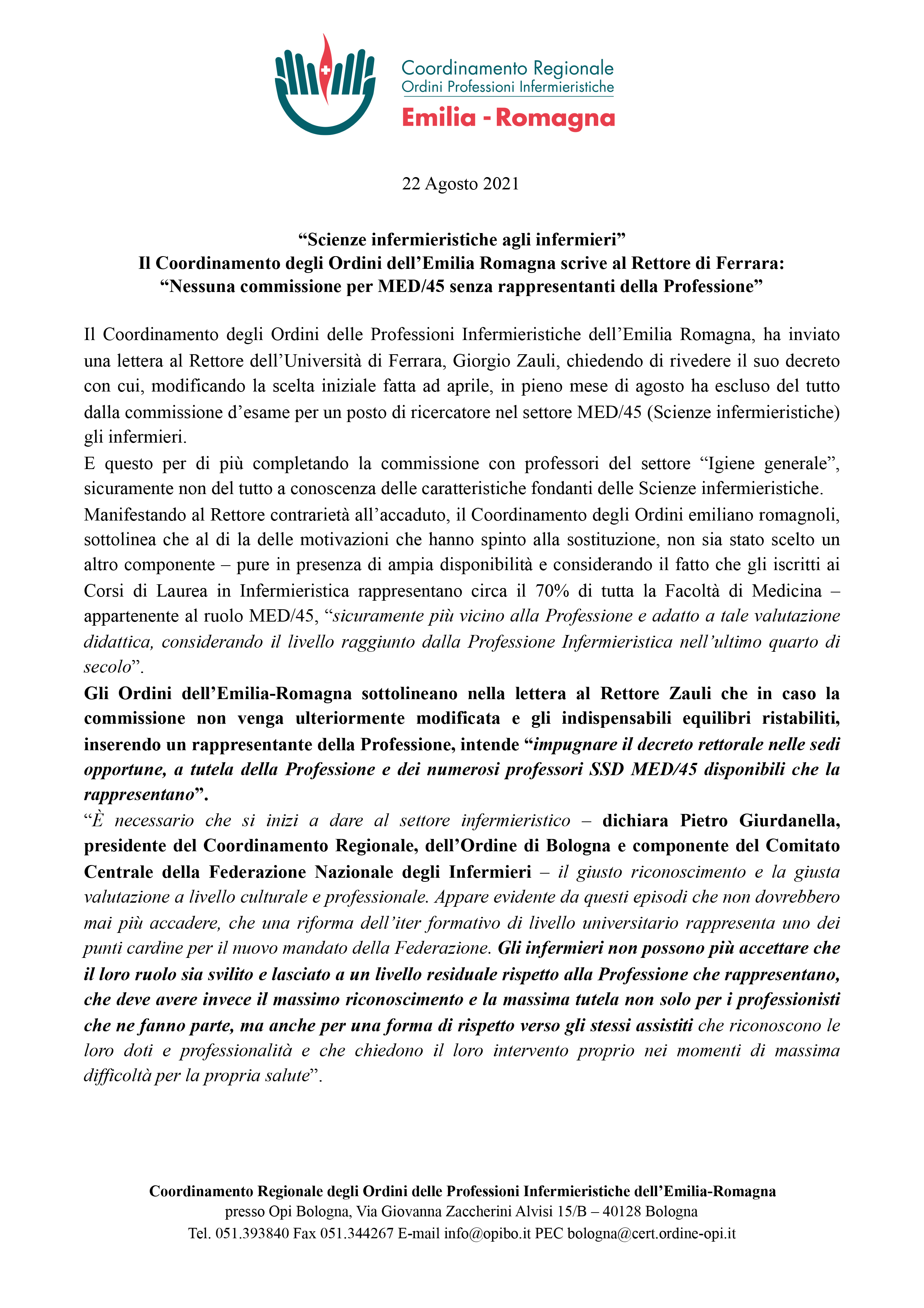 Manifestando al Rettore contrarietà all’accaduto, il Coordinamento degli Ordini emiliano romagnoli, sottolinea che al di la delle motivazioni che hanno spinto alla sostituzione, non sia stato scelto un altro componente – pure in presenza di ampia disponibilità e considerando il fatto che gli iscritti ai Corsi di Laurea in Infermieristica rappresentano circa il 70% di tutta la Facoltà di Medicina – appartenente al ruolo MED/45, “sicuramente più vicino alla Professione e adatto a tale valutazione didattica, considerando il livello raggiunto dalla Professione Infermieristica nell’ultimo quarto di secolo”.