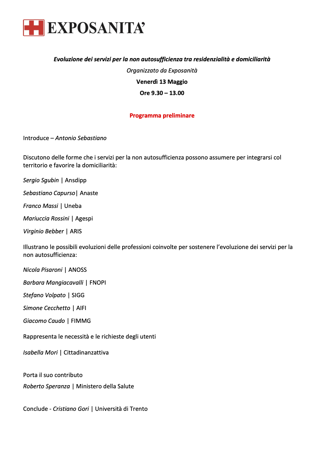 • “Evoluzione dei servizi per la non autosufficienza tra residenzialità e domiciliarità (venerdì 13 maggio, ore 9) INFO