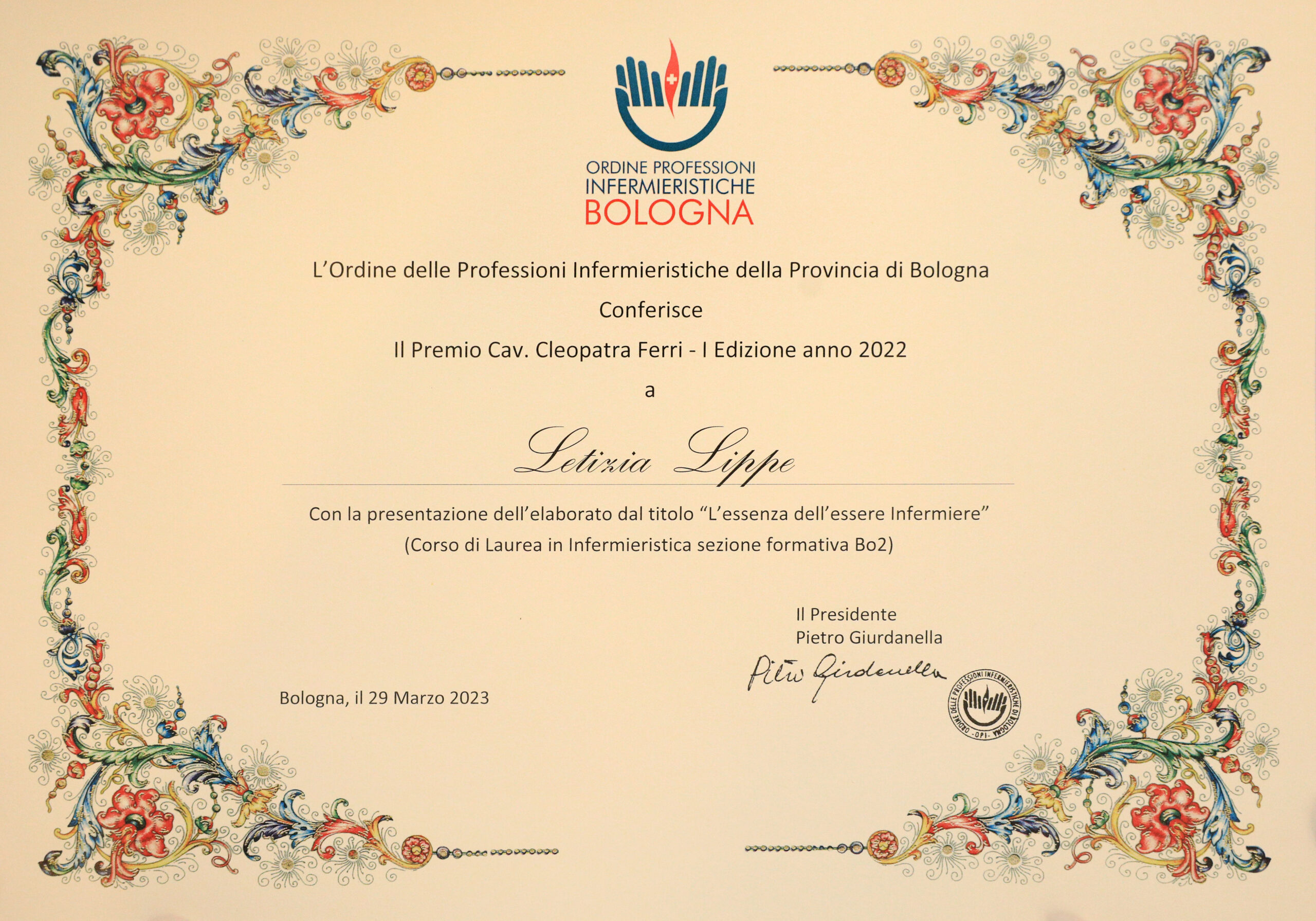 Ieri 29 marzo, nell’ambito dell’Assemblea annuale dell’Ordine delle Professioni Infermieristiche di Bologna sono stati consegnati i 2 premi di studio intitolati “Cav. Cleopatra Ferri” per l’anno 2022. Gli elaborati risultati vincitori con il titolo “L’essenza dell’essere infermiere “e “L’arte della cura”, rispettivamente delle studentesse Letizia Lippe del corso di Laurea di Bologna 2 e Martina Mazzeo del Corso di Laurea presso la sezione formativa di Imola saranno pubblicati sul nostro sito.