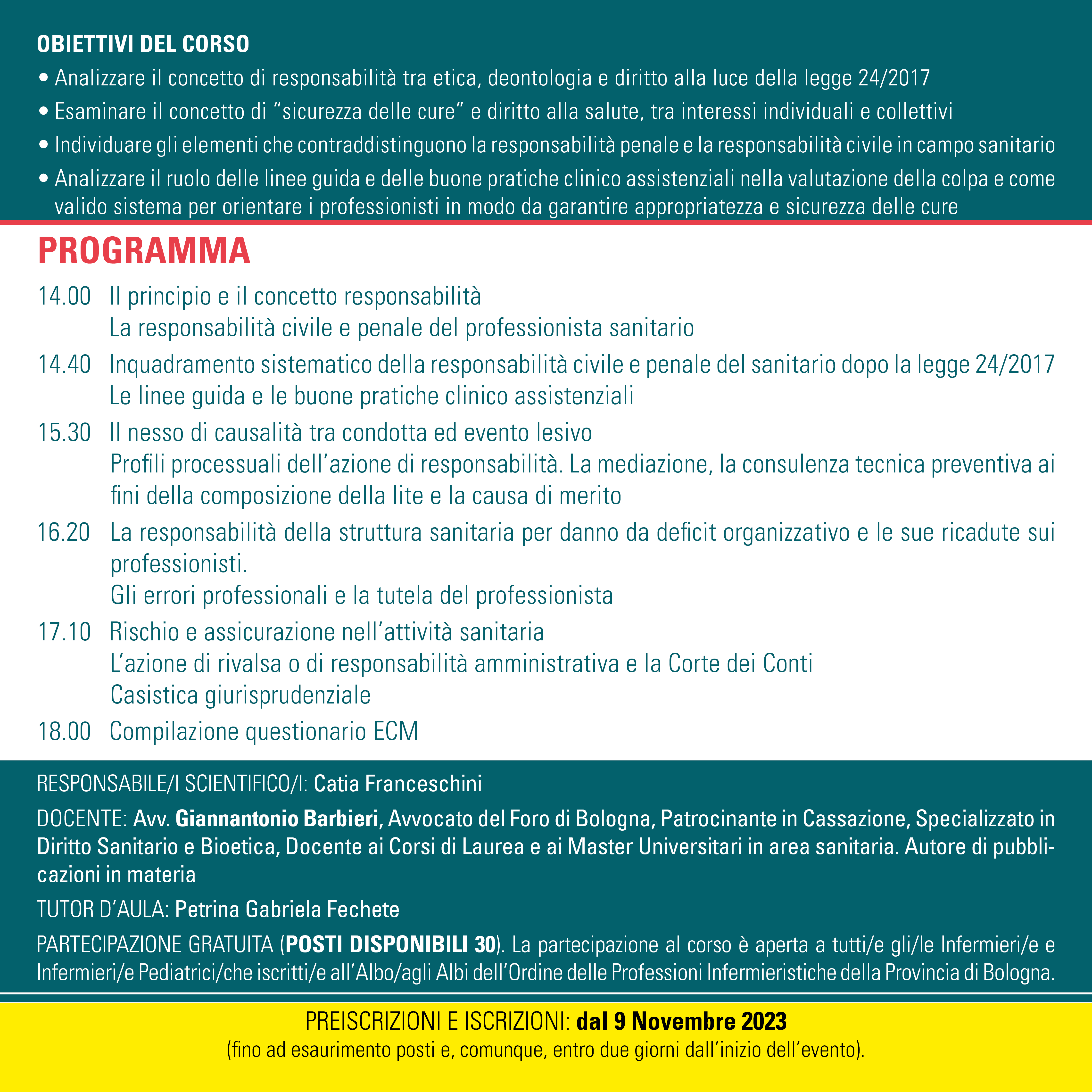 Il corso si proponeva la finalità di affrontare e delineare, con modalità prevalentemente dialettica con i partecipanti, il tema della responsabilità professionale in campo infermieristico, muovendo dal concetto stesso di responsabilità e arrivando a delineare, seppure per sommi capi, gli istituti della responsabilità civile e penale e le loro conseguenze in capo ai professionisti.