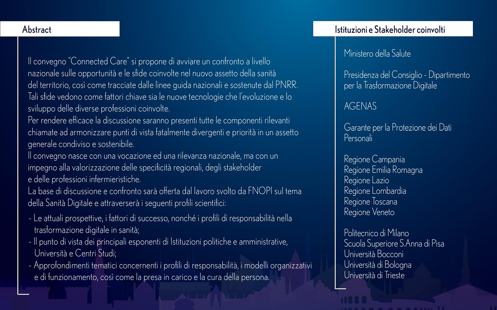 Con l’ambizione di trovare risposte a queste e altre domande legate all’attuale panorama della Salute in Italia e avviare un confronto a livello nazionale sui nuovi equilibri fondati sulle linee guida nazionali sostenute dal PNRR, la Federazione Nazionale Ordini delle Professioni infermieristiche organizza il 17 settembre a Bologna il convegno “Connected Care – Frontiere attuali e fattori di successo nella trasformazione digitale in sanità”. L’evento, per partecipare al quale a breve saranno diffuse le modalità di iscrizione, si svolgerà dalle ore 10 alle ore 17 nella prestigiosa Aula Absidale di Santa Lucia. È stato organizzato in collaborazione con l’Università di Bologna e riunirà nella sala del polo universitario rappresentanti di Ministero della Salute, Dipartimento della Trasformazione digitale della Presidenza del Consiglio, Agenas e Garante per la Protezione dei Dati Personali. Al dibattito contribuiranno anche presidenti e referenti delle Regioni e delle Università italiane. Nel confronto si toccheranno i principali temi connessi alla sanità digitale, a partire dal lavoro svolto sul tema dalla FNOPI su:
